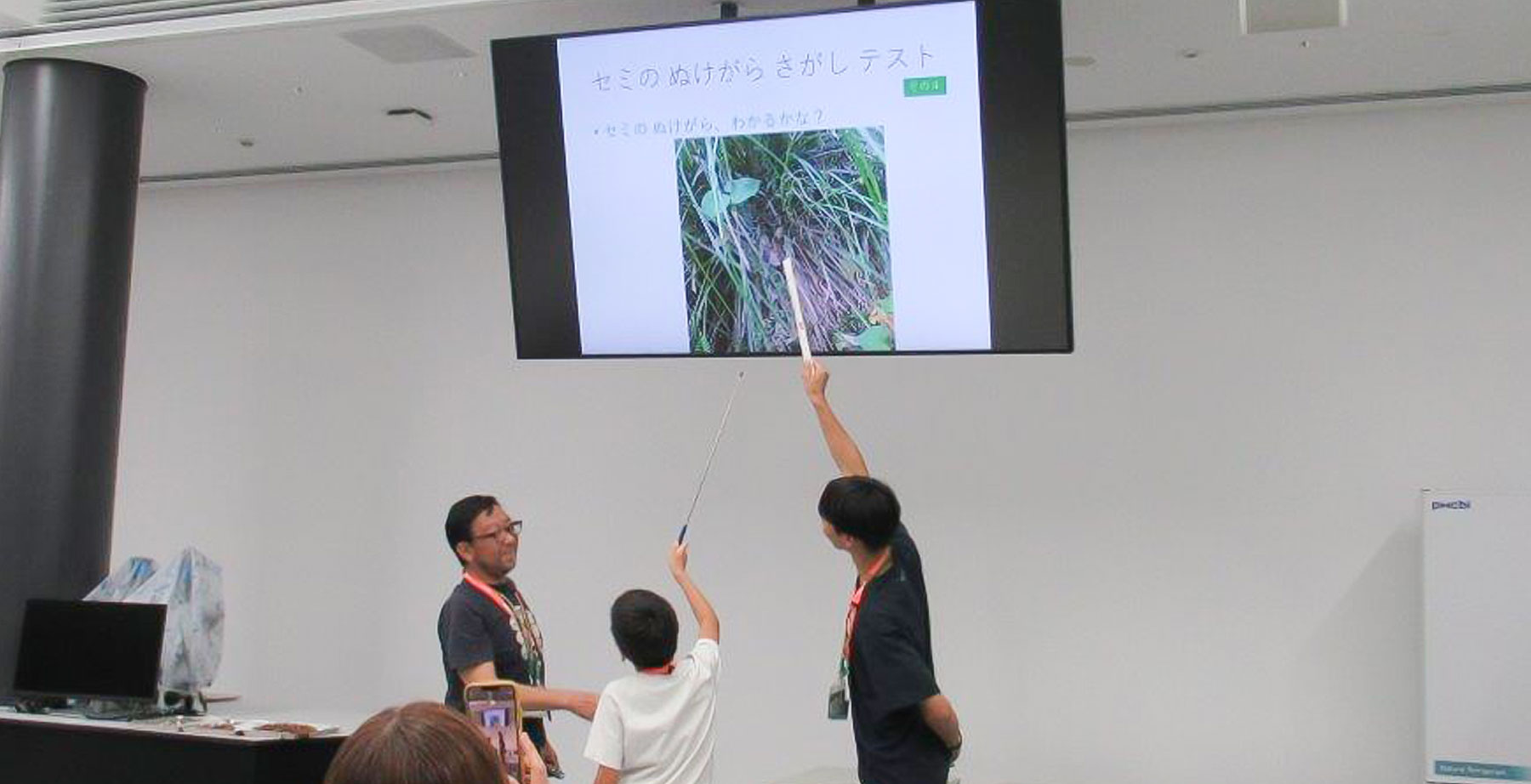 参加者はまず、「セミクイズ」に挑戦しました。セミの不思議な生体がクイズとして分かりやすく示され、子供たちは競うように回答していました。また、セミの産卵や孵化、羽化については映像で、セミの一生については絵本で、セミの鳴き声は音声で、セミの種類は標本でというように、さまざまの教材を効果的に使って解説され、子供たちは飽きることなく熱心に話に耳を傾けました。