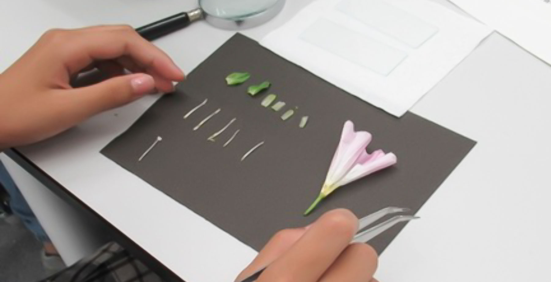 花のつくりを観察する前に、自分が持っている「花」のイメージを学習シートに描くことから教室は始まりました。まずは花のつくりを確かめるため、今回用意された花の中からヒルガオとムクゲを選び、「花の解剖」を始めました。講師から説明を受けながら、花びらから順番に、がく、おしべ、めしべをピンセットで外してゆき、「観察シート」に貼り、形や数を調べていきました。さらに、最初に自分が描いたイメージとの違いも確かめました。また、今回は目では見えない花粉の形の違いをみるため、顕微鏡を使って観察しました。ユリの花粉はラグビーボール型をしていることや、ムクゲの花粉は丸い形で、表面に多数のトゲがあることが分かりました。