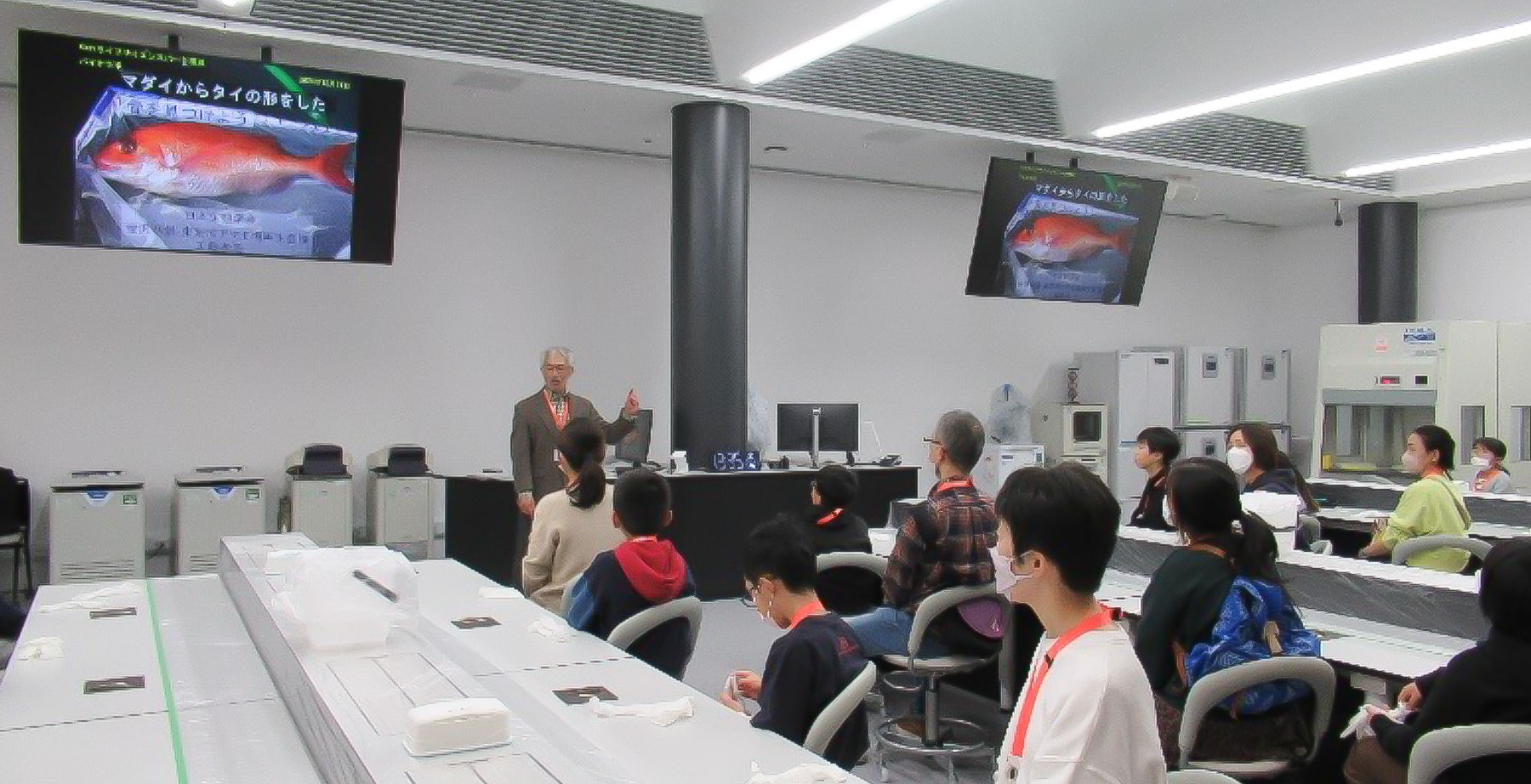 2024年12月21日、日本魚類学会 金沢八景―東京湾アマモ場再生会議 工藤孝浩先生が講師を務める実験教室を開催しました。対象は小学校4年生~6年生の親子で、「タイのタイ」と呼ばれる魚の形をした骨の観察を通して、魚という資源を守る「栽培漁業」という取り組みについて学びました。
