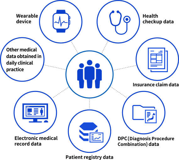 By utilizing real-world data (RWD), we promote the efficiency and sophistication of the clinical development process of new drugs, the verification of drug values, and understanding of diseases, to provide an optimal treatment for each patient.