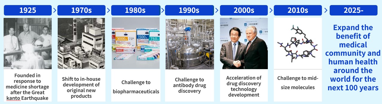 Our 100-year history has been a series of challenges. Starting with the challenge of developing our own new drugs in the 1970s, we continued to take on challenges in small molecule, biopharmaceutical, and antibody drug discovery. Our strategic alliance with Roche further accelerated our drug discovery technology development. And now, we are embarking on the challenge of mid-size molecule drug discovery, targeting disease-related molecules that were previously unreachable with existing drugs. This is a venture into uncharted territory.