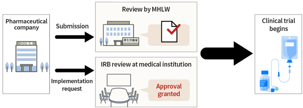 Based on the submission from the pharmaceutical company, the MHLW reviews whether the trial complies with applicable regulations. The medical institution consults the IRB*1 to determine whether the clinical trial can proceed and makes a final decision based on the IRB's findings.