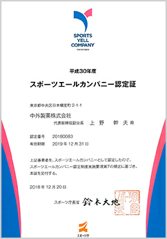 Chugai was certified by Japan Sports Agency, as a company that actively the promotion programs to foster sports. In 2018, 347 companies are certified.