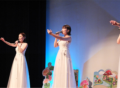 As the children entered the auditorium, they each put on their choice of headband, participating in the musical by “becoming” Momotaro. As Anji Hino, RiRiKa, Kotone and other former members of the Takarazuka Revue performed the tale through powerful words and song, the children had great fun responding with shouts, dances and movement.