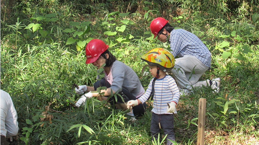 After using grass sickles to cut down the thick growth of Amanezasa (Pleioblastus chino) that covered the area, they also worked carefully to dispose of trees that had toppled during a recent hurricane. It was a valuable opportunity to enjoy conversation and work with members from other departments whom the participants might not otherwise meet. After partaking of box lunches and Tonjiru (pork and vegetable soup), the volunteers broke up into work group, craft group, and nature-observing group, and enjoyed the kind of experience only possible in the fall. Participants commented that it was fun to enjoy familiar nature, that they hoped to participate with their families again next year, and that it felt great to be out in nature.