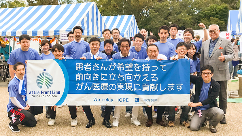 Relay for Life Japan (RFLJ) is an awareness support campaign that forges ties in the fight against cancer, the highlight of which is a 24-hour walk-a-thon in which cancer patients, their families and supporters compete as relay teams. The event aspires to celebrate the lives of cancer survivors, honor the memories of loved ones who have died, and stand up in the fight to conquer cancer by educating the public about prevention and exams. In 2019, the event was held in 48 locations throughout Japan. Chugai employees have participated as volunteers in the RFLJ since 2007, and in 2019, a total of 600 employees participated in “Team Chugai” at 31 locations nationwide. As “Team Chugai” members described the display on TRY scope, participants looked into their viewers to learn about phenomena related to cancer, gaining an understanding of the importance of early discovery and treatment of cancer.