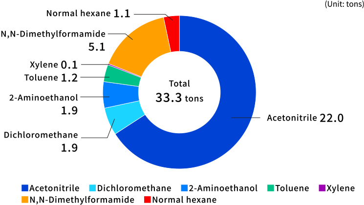 The total volume of substances covered by the PRTR Law *1 was 33.3 tons. The use of N,N-dimethylformamide, an SVHC-listed substance used in manufacturing, was significantly reduced by adopting a new alternative substance not subject to the SVHC designation.