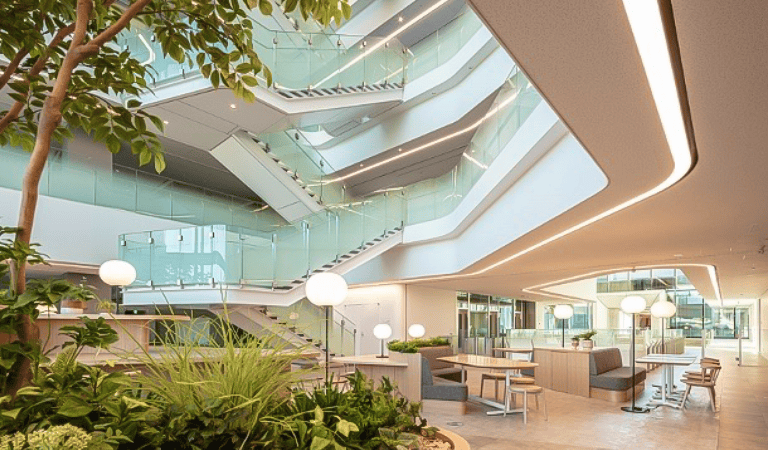 For the offices at Chugai Life Science Park Yokohama, natural lighting, interior lighting and air conditioning are controlled using the latest information and communications technology. Illumination and air conditioning efficiently focus on areas where people are present, and lights are turned off and air conditioning air flow is reduced automatically in unoccupied areas. In addition, window blinds are automatically controlled according to the amount of sunlight, making active use of daylight.