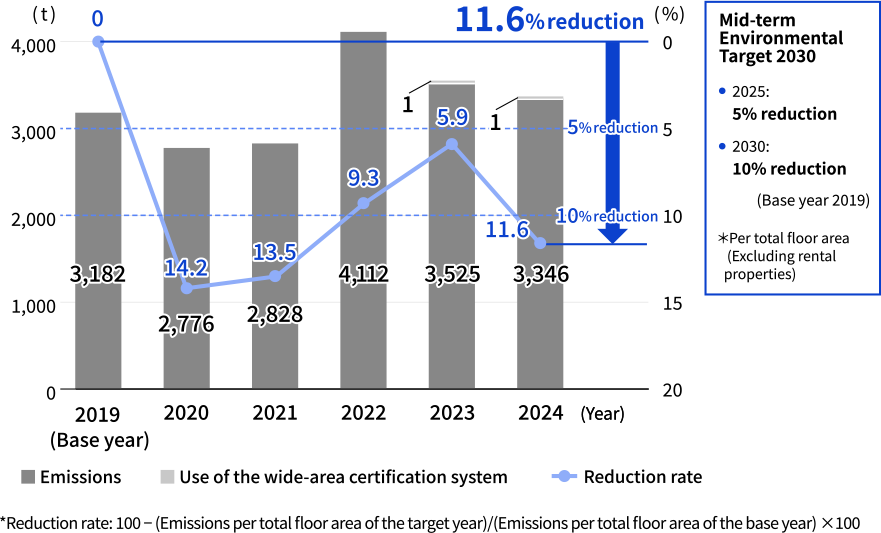 On the other hand, emissions per total floor area were 9.3 kg/m2, down 11.6% from 10.5 kg/m2 in the base year and up 0.6 kg/m2 from the previous year. We will continue to promote waste reduction efforts by reviewing our waste generation process while promoting proper disposal of waste.
