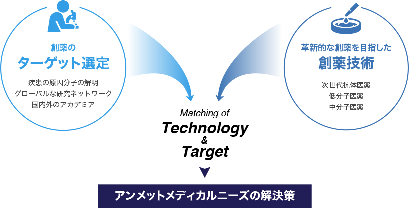 特定の疾患に焦点を絞り創薬に取り組むというアプローチに対し、中外製薬では、創薬に応用可能な「技術」を先に開発しその技術を医薬品に適用することで、ファーストインクラス*1、ベストインクラス*2の新薬を連続的に創出することを目指しています。