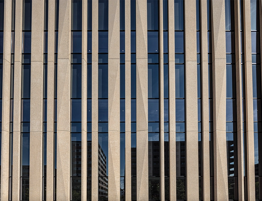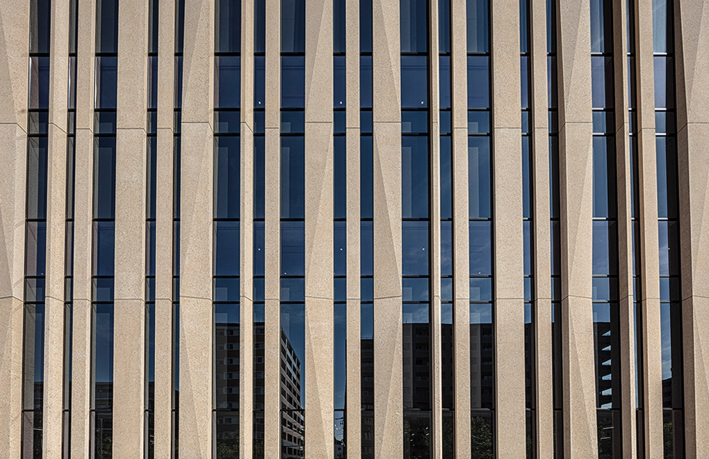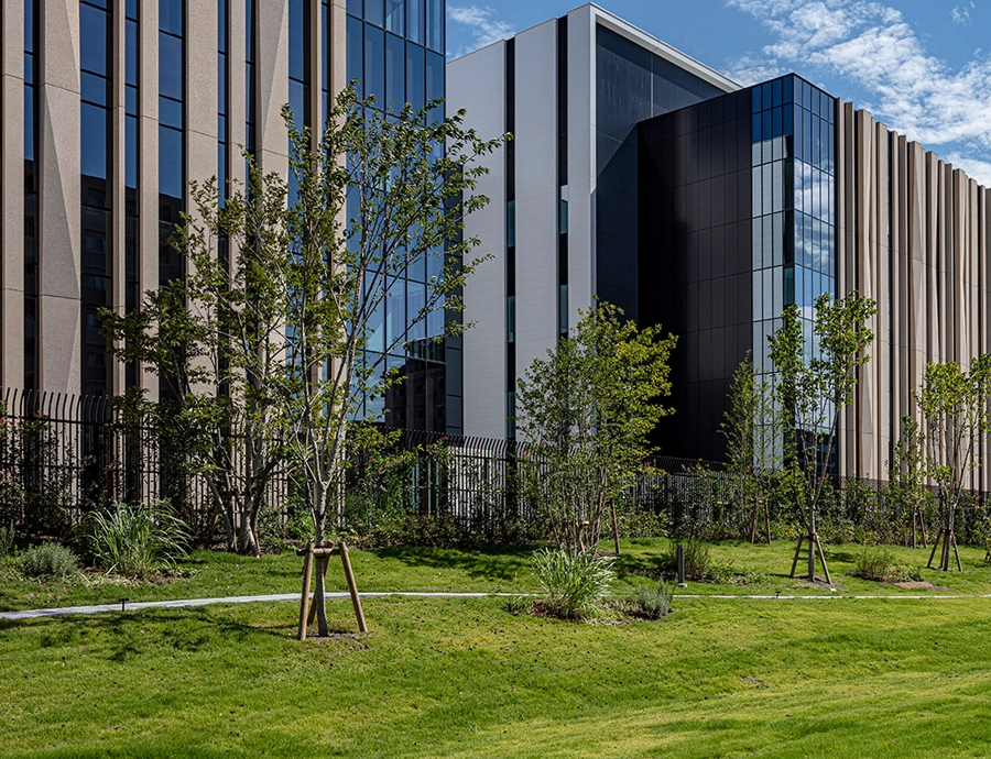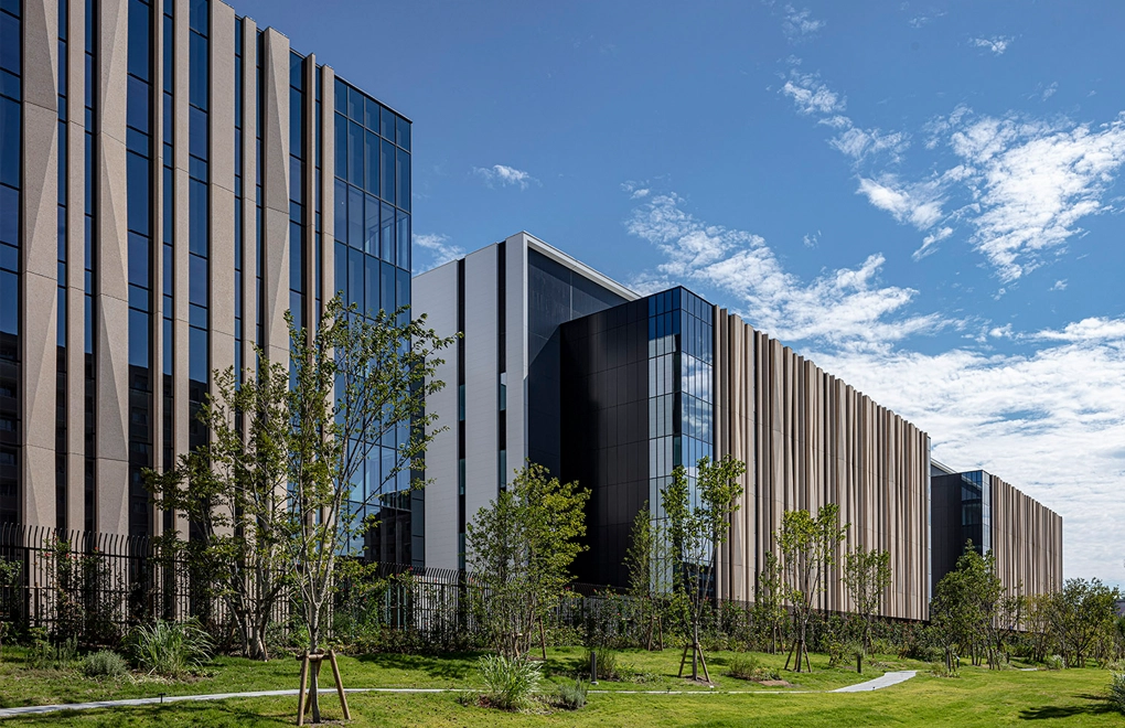 緑を多く取り入れ、地域社会との調和、環境との共存をコンセプトに、サステナビリティと安全に配慮した研究施設です。周辺の街並みとの調和を図り、建物は分棟に配置し、外装にはアースカラーを採用しています。白とアースカラーを中心とした色彩で、クリーンでアカデミックなデザインにし、研究所全体としての統一感を図っています。