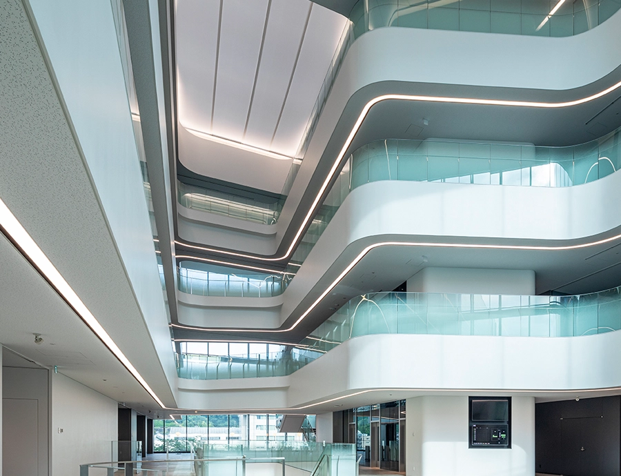 居室棟には、論文の作成など研究員がデスクワークを行う執務室が集約されています。象徴的なデザインの吹抜が上下階の一体感を、開放感溢れるフロア空間が研究員同士のコミュニケーションを活性化させます。
