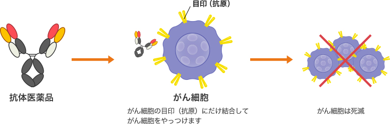 抗体は、特定の異物にある目印(抗原)に特異的に結合して、その異物を体内から除去する分子です。抗体をがんの治療に応用する場合、抗体は、がん細胞の表面にある目印(抗原)をピンポイントで狙い撃ちできますが、目印(抗原)のない正常な細胞には結合しません。したがって、高い治療効果と副作用の軽減が期待されます。