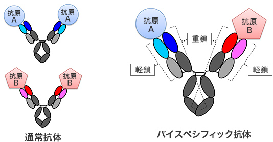 2種類の異なる抗原と結合できる「バイスペシフィック抗体」の工業生産を可能にする技術です。2種類の抗原との同時結合による薬効の増強や、2種類の抗原をつなぐことによる薬効の発現といった多様な効果が期待されています。