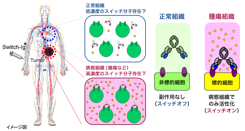 従来の抗体は、疾患部位だけでなく正常組織でも標的抗原に結合して副作用が生じるといった問題がありましたが、スイッチ抗体技術はこうした課題を解決し、抗体の疾患部位への特異性を高めることが期待される技術です。