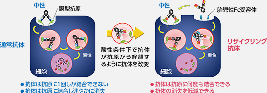 「SA237」に適用している、中外製薬独自のリサイクリング抗体技術は、酸性条件下で抗体が抗原から解離するようにデザインされ、何度も抗原に結合できるため、大幅に長い血中滞留性と薬効持続性を示します。いまだ承認された治療薬がない視神経脊髄炎に対して、「SA237」は世界的に注目を集めています。