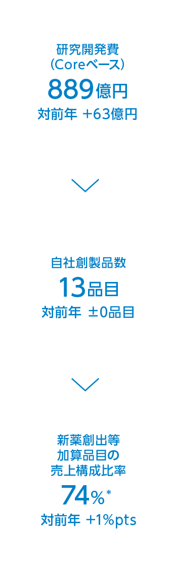 この特性を活かして、独自の研究技術の進化を続けており、パイプラインに占める自社創製品数は13品目と充実しています。発売後の製品を見ても、その内容はアンメットメディカルニーズに応えるものとなっており、ロシュ導入品も含め、新薬創出等加算品目の売上構成比率は74%と非常に高くなっています。