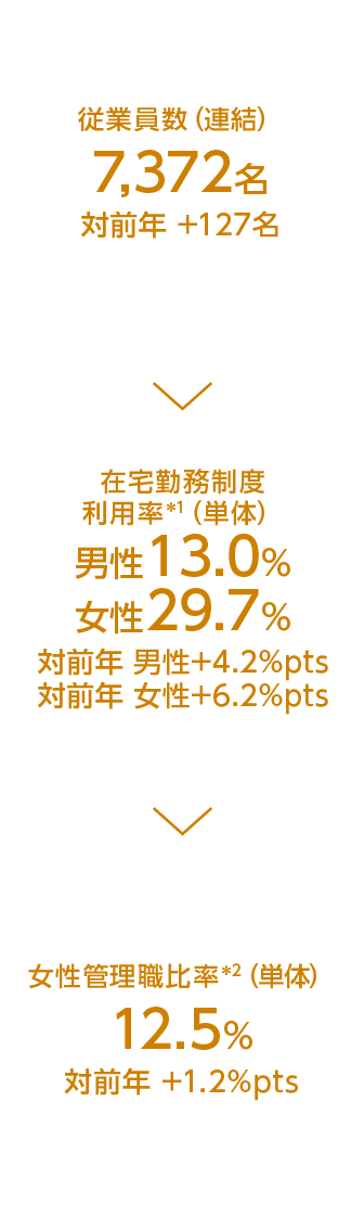 人財マネジメントとしては、経営戦略にのっとり、イノベーションを生み出していく人財の創出に注力。特に、ダイバーシティ&インクルージョン(D&I)の取り組みとして、女性管理職比率や在宅勤務制度利用率の向上などを目指しています。これらの比率が年々高まっていることからもインクルーシブな組織風土の醸成に向けて着実に進化を遂げているととらえています。