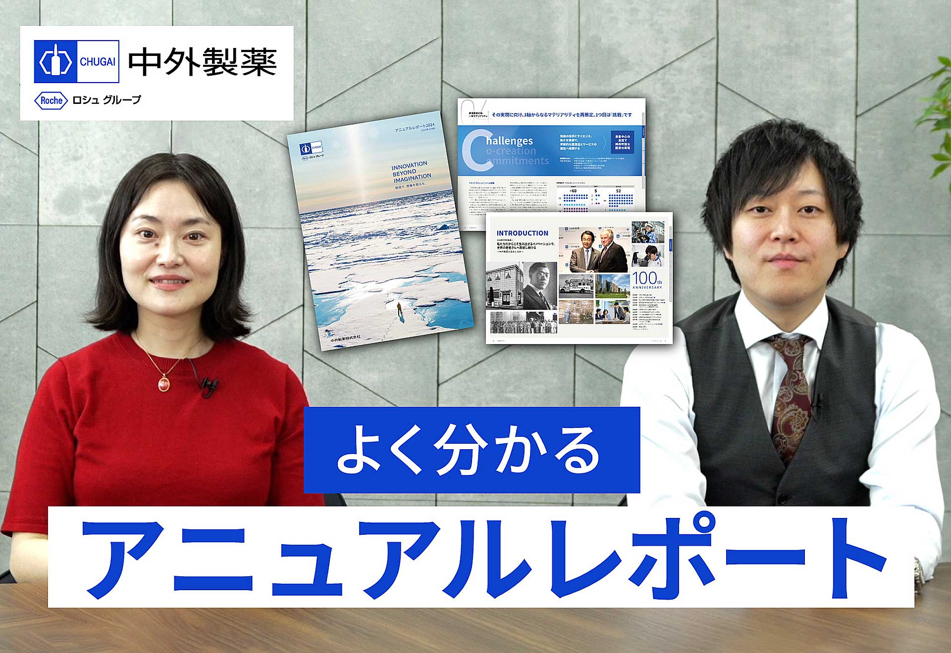 より多くの投資家の方々にアニュアルレポートを読んでいただけるように、紹介動画を作成しました。本レポートの制作リーダーとともに、社内副業制度を通じて制作に参加したMR(医薬情報担当者)が、初心者の視点から、「過去から未来に続く挑戦(イノベーション)」をテーマにした創業100周年特別編集ページ、中外製薬の今後の成長に関わる重要な要素(マテリアリティの見直し、新人事制度、トップメッセージなど)について分かりやすく紹介しています。