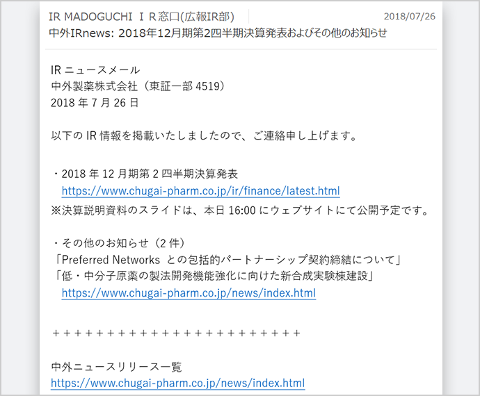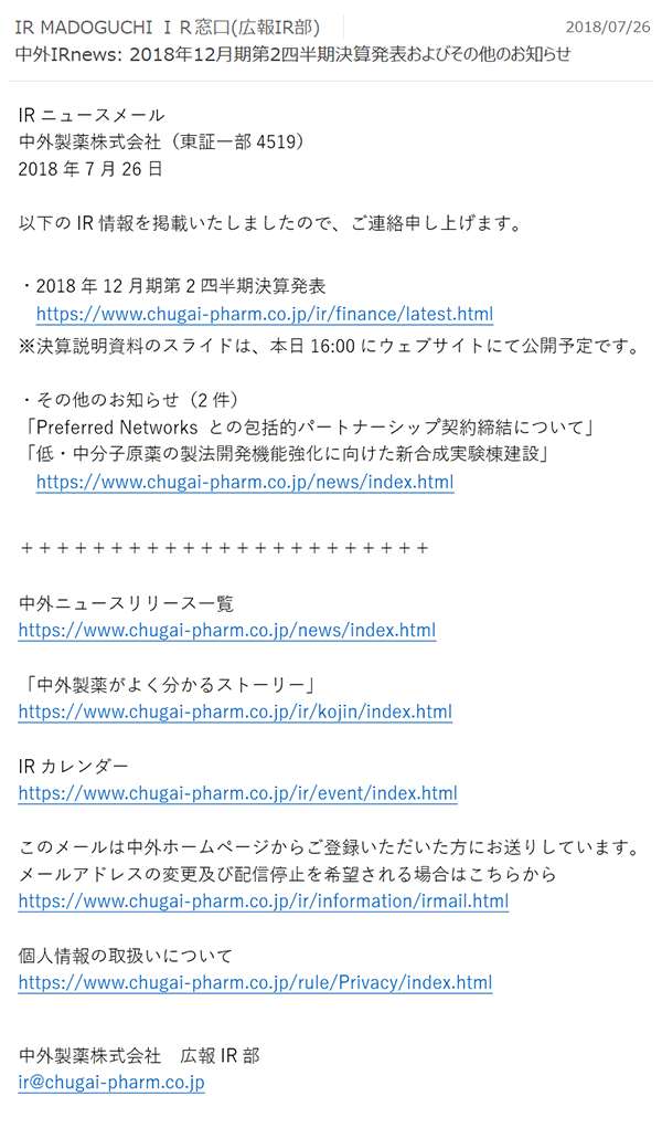 IRニュースメール登録・変更・削除 View in English IRニュースメールについて 株主や投資家の方々に重要と思われる情報をタイムリーにお知らせします。 配信内容 中外製薬が発表するニュースリリース 決算情報や東京証券取引所への開示事項 IRサイトの更新情報 等 サンプルを見る 新規登録はこちらから IRニュースメール新規登録 登録アドレスの変更・登録解除はこちらから 登録アドレスの変更 登録解除