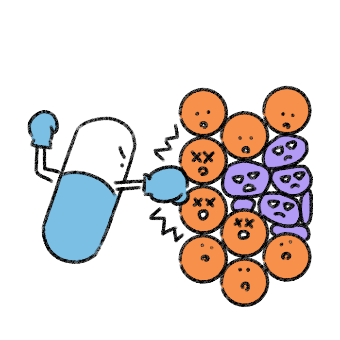 がんのくすりが、かみの毛やつめ、口の中の細胞を攻撃(こうげき)するとぬけ毛や爪の変色や変形、口内炎(こうないえん)になる。治療が終われば、元に戻る。
