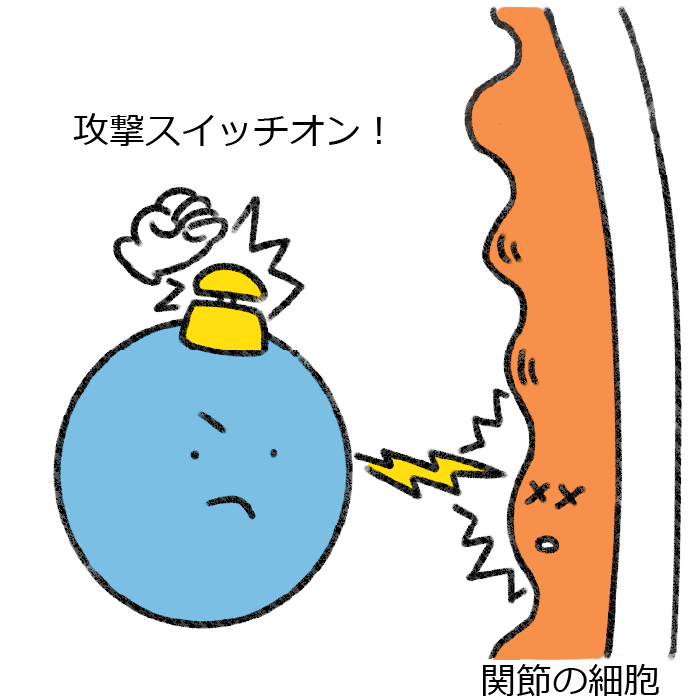 免疫がかんちがいして自分の細胞をやっつけることで、炎症がおきる。手の指・関節などがはれていたい。