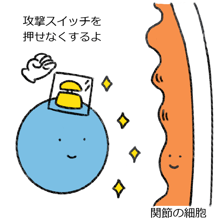 免疫のかんちがいをおこさせないしくみのくすり。関節のいたみやはれなどのリウマチの症状をほぼなくすことが可能に。また、症状が出てからすぐに治療(ちりょう)を始めることで関節が変形することを防ぐことができる。