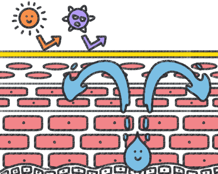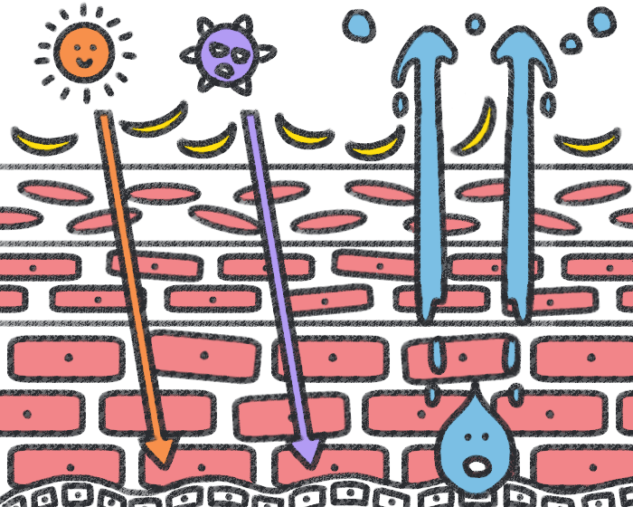 2皮ふのバリアがこわれると、表面から水分がからだの外に出やすくなり、外部から刺激が入りやすくなる。