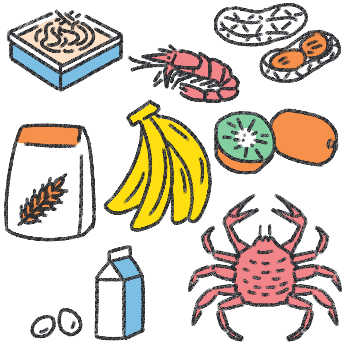 エビ・カニ、果物(バナナ、キウイフルーツ)、たまご、牛乳(ぎゅうにゅう)、らっかせい、くるみ、小麦、そば