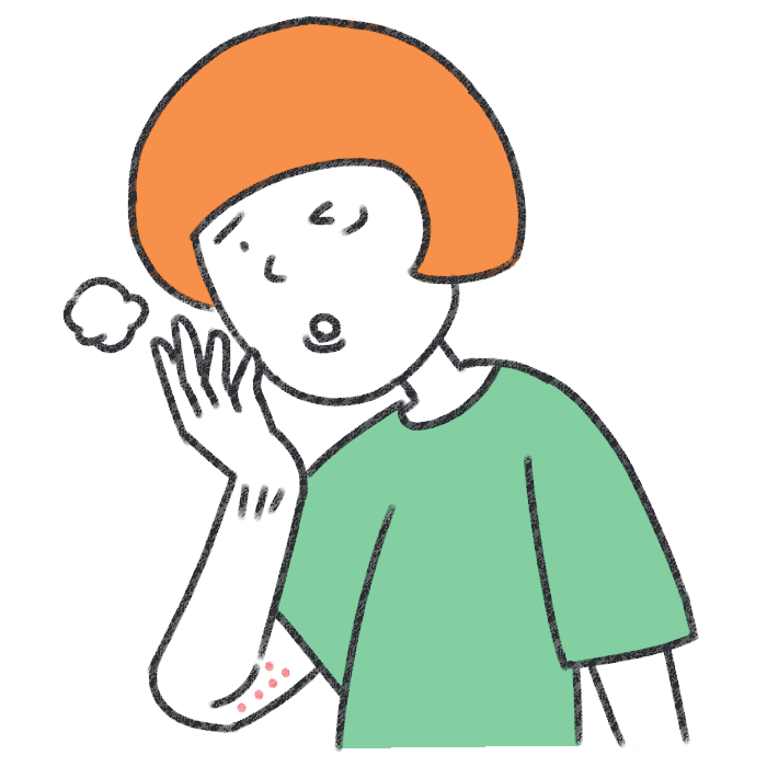 まぶたのはれ、くちびるのはれ、鼻づまり・くしゃみ、せき・息が苦しい、じんましん、かゆみなど