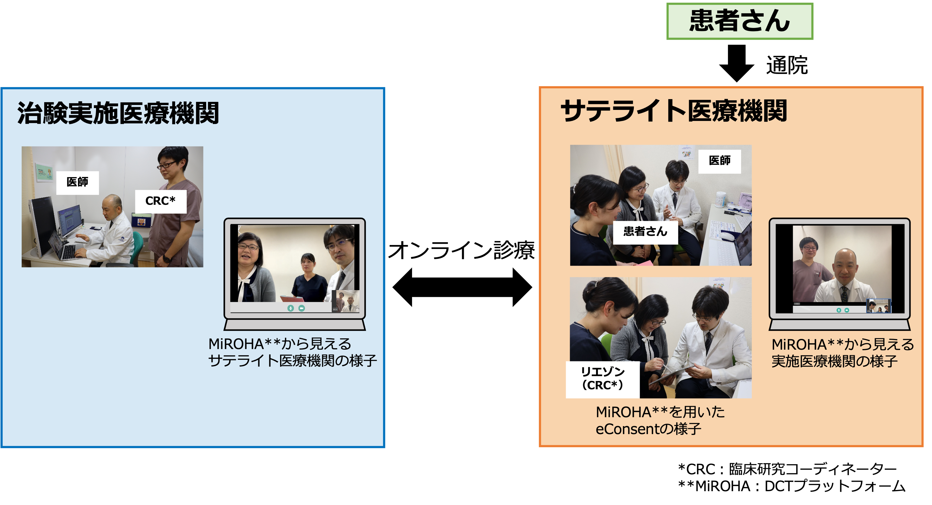本試験は、中外製薬主導の進行固形がん患者さんを対象とした第I相臨床試験で、国立がん研究センター中央病院が治験実施医療機関として、DCTによる負担軽減効果が期待できる地域(国立がん研究センター中央病院への移動時間が片道120分を超える地域)にある大阪医科薬科大学病院がサテライト医療機関として参加しています。本試験の一部の来院では、患者さんは治験実施医療機関のかわりにサテライト医療機関に来院し、オンライン診療を活用して、臨床試験に関わる検査や評価を受けることができます。オンライン診療にはMICINが提供するDCTプラットフォーム「MiROHA(ミロハ)」を用いており、eConsentを活用した遠隔再同意も実施予定です。