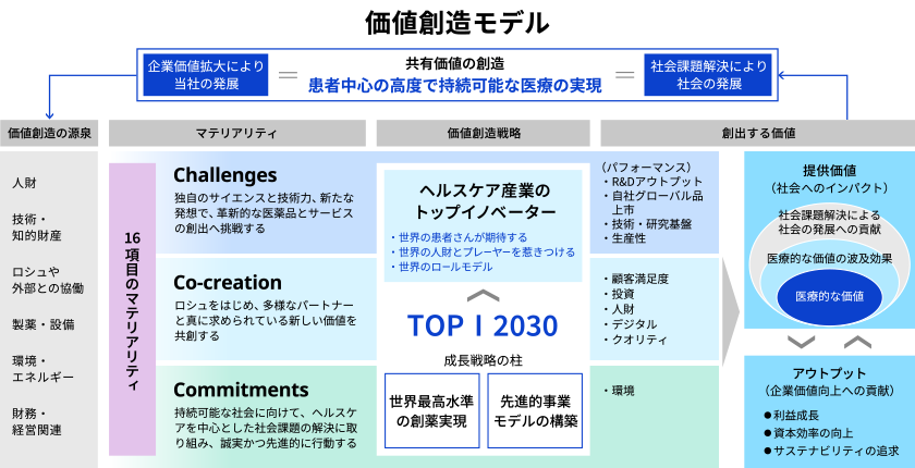 こうした環境展望を踏まえ、中外製薬は、価値創造の源泉である人財、技術・知的財産、ロシュや外部との協働、製薬・設備、環境・エネルギー、財務・経営関連といった経営資源を投下する方向性を定め、「共有価値の創造」に向けたマテリアリティ(重要課題)のもと、中長期視点の価値創造に向けた取り組み(価値創造戦略)を進めます。