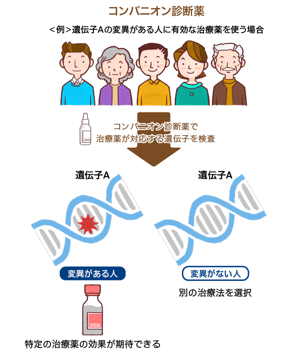 個別化医療の治療薬の有効性を高め、より安全に使うためには、患者さんがその治療薬を使う対象であるかどうかを正しく見極める必要があります。例えば、ある治療薬が特定の遺伝子Aに変異がある病気に有効とします。遺伝子Aに変異のない患者さんには効果が期待できないので、あらかじめ患者さんの遺伝子変異の有無を調べておきます。このとき使われるのがコンパニオン診断薬です。
