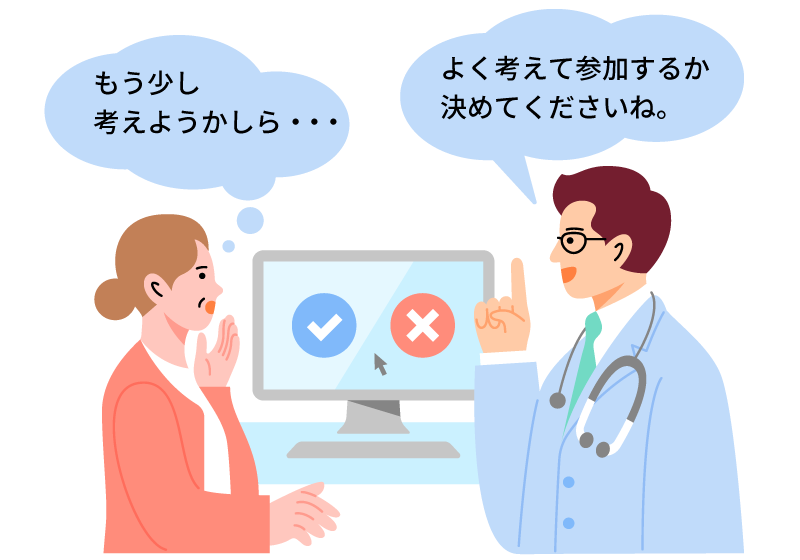 いずれも、参加できそうな方に医師が治験に関する説明を行い、文書で参加の意思を確認します。医師や医療スタッフから治験の説明を受けた場合、治験に参加するかどうかは治験に参加される方の自由な意思で決めることができます。つまり、医師から紹介を受けた際にどんな理由でも断ることができます。