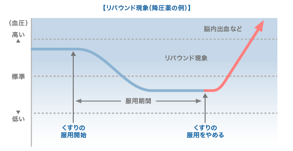 血圧が下がったからといって、薬を急に止めてしまうと血圧が反動的に上昇し、脳内出血を起こすことがあります。