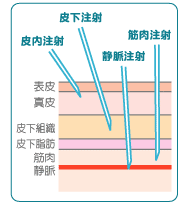 皮膚と筋肉の間にある皮下組織というところに注射します。ワクチンやインスリンなどがこの方法をとっています。一般には吸収がゆっくりで、効果が長く続きます。インスリンの中には速く吸収されるものもあります。