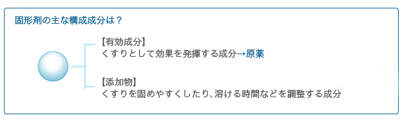 薬には原薬のほかに薬を固めやすくしたり、溶ける時間などを調整する成分が含まれています。