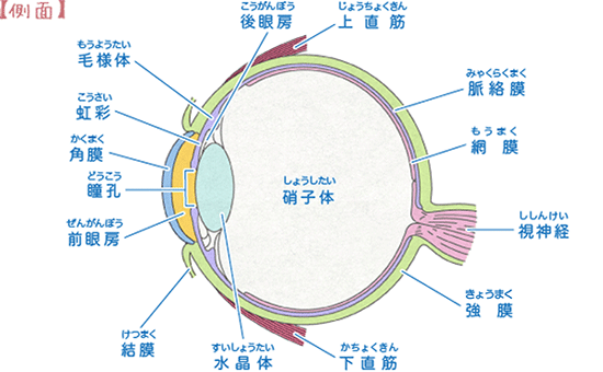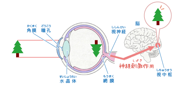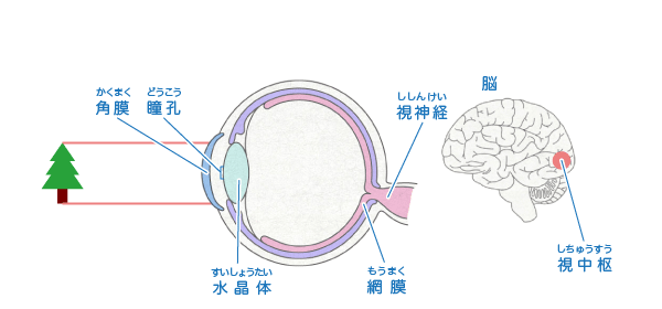 光は角膜(かくまく)を通り、瞳孔(どうこう)、水晶体(すいしょうたい)を通過して網膜(もうまく)にあたります。水晶体(すいしょうたい)がレンズの役割をし、網膜がフィルムの役割をしています。網膜では明るさ、形、色が認識され、その情報が視神経(ししんけい)を通って脳に伝わることで、物が見えます。