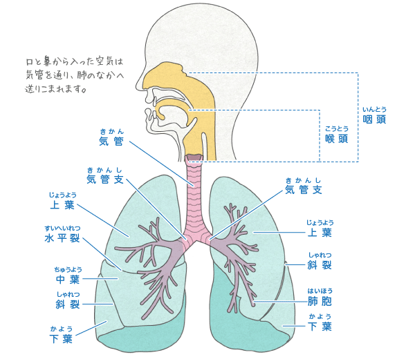 肺は、空気中の酸素をからだに取り入れ、いらなくなった二酸化炭素を外に出すはたらきをしています。鼻や口から吸い込んだ空気は喉頭(こうとう)を通り、気管(きかん)に入ります。気管は左右の肺のなかに入ると、2つに分かれて気管支(きかんし)となります。気管支はさらに細かく分かれて、その先には肺胞(はいほう)という空気が入った小さな袋(ふくろ)が、ブドウの房(ふさ)のように付いています。