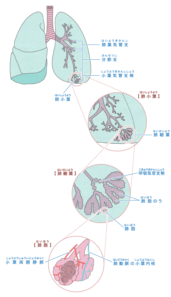 気管支は、肺葉気管支(はいようきかんし)、分節支(ぶんせつし)、小葉気管支梢(しょうようきかんししょう)の3つに分かれており、だんだんと小さくなって行きます。いちばん小さい小葉(しょうよう)のなかのさらに細かい部分を肺細葉(はいさいよう)と呼びます。肺細葉は、卵型をしているものが集まった呼吸気管支梢(こきゅうきかんししょう)と、袋状(ふくろじょう)の肺胞(はいほう)からできています。肺胞ひとつの大きさはわずか10分の1mmほどです。