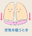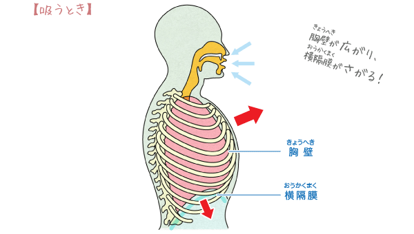 肋骨(ろっこつ)の間の筋肉が伸(の)びると胸壁(きょうへき)が広がり、肺も横に引っ張られてふくらみます。同時に横隔膜が縮んで下にさがるので、肺は下に引っ張られてふくらみます。ふくらんだ肺の中へ空気が入って行きます。