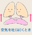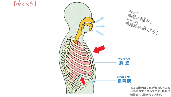 肋骨の間の筋肉が縮み、胸壁を縮ませるため肺も押(お)されて縮みます。 同時に横隔膜も伸(の)びて上にあがるので肺も下から押しあげられて小さくなります。肺が縮むことで、肺の中の空気が外へ押し出されます。