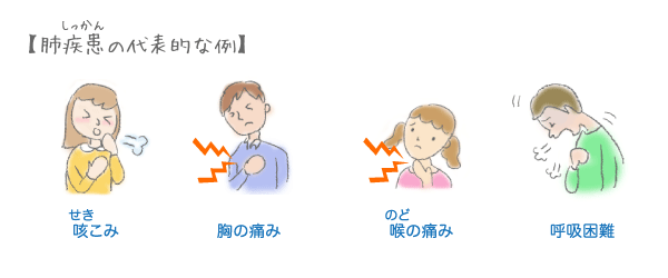 咳(せき)、たん、胸の痛み、呼吸困難、発熱、からだのだるさ、食欲がなくなるなど。