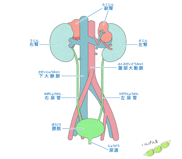 尿(にょう)を作り出したりする大切な器官です。大切な器官です。腰(こし)のくびれのやや上あたりに2 つあり、尿管(にょうかん)という管で膀胱(ぼうこう)とつながっています。腰(こし)のくびれのやや上あたりに2つあり、尿管(にょうかん)という管で膀胱(ぼうこう)とつながっています。
