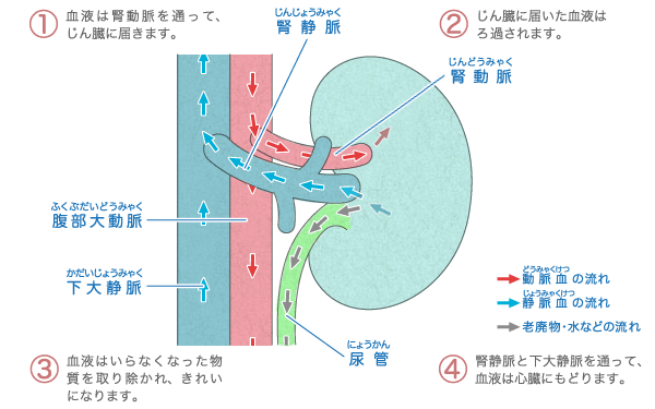 じん臓は、腎臓(じんぞう)と書きます。血液をろ過し、尿をつくります。そのほかには、からだの中の水分や血圧、体液のバランスなどを調節したり、生きていくために必要なホルモンなどをつくる大切な臓器です。