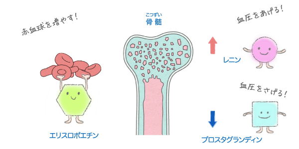 骨髄(こつずい)で作られる赤血球(せっけっきゅう)を増やすホルモンや、血圧を調整するホルモンを作っています。