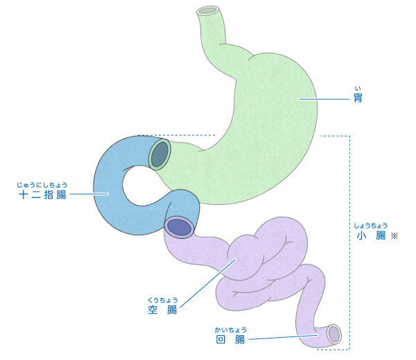 ※十二指腸は正しくは小腸の一部ですが、一般的には空腸(くうちょう)と回腸(かいちょう)の部位を指して小腸といわれています。