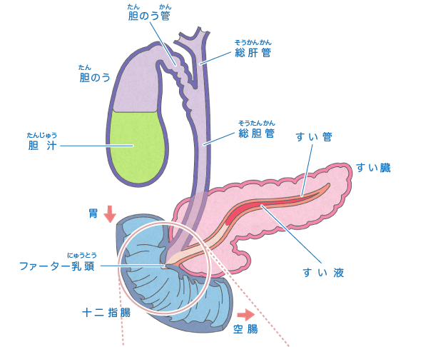 胃で消化された食べ物が十二指腸に入ってくると、さまざまなホルモンが分泌(ぶんぴつ)されます。ホルモンが胆(たん)のうやすい臓に、はたらきかけることによって胆汁(たんじゅう)とすい液が押(お)し出され、ファーター乳頭から十二指腸の中に流れ込みます。胆汁(たんじゅう)やすい液によって混ぜられた食べ物は空腸に送られ、さらに消化・吸収が行われます。