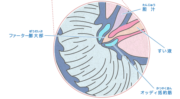 十二指腸の中間あたりには、胆のうからつながる胆のう管(たんのうかん)と、すい臓からつながるすい管の開口部があり、ファーター乳頭(にゅうとう)と呼ばれています。ファーターとは、発見したドイツ人解剖学者アブラハム・ファーターから名づけられました。オッディもイタリア人解剖学者の名前だといわれています。
