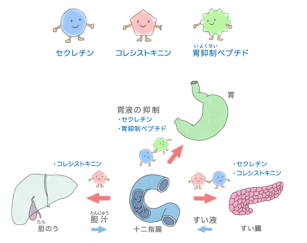 胃液で酸性になった食べ物が入ってくると十二指腸の粘膜(ねんまく)から分泌されます。アルカリ性であるすい液の分泌をうながしたり、胃液の分泌を抑(おさ)えるようにはたらきかけます。
